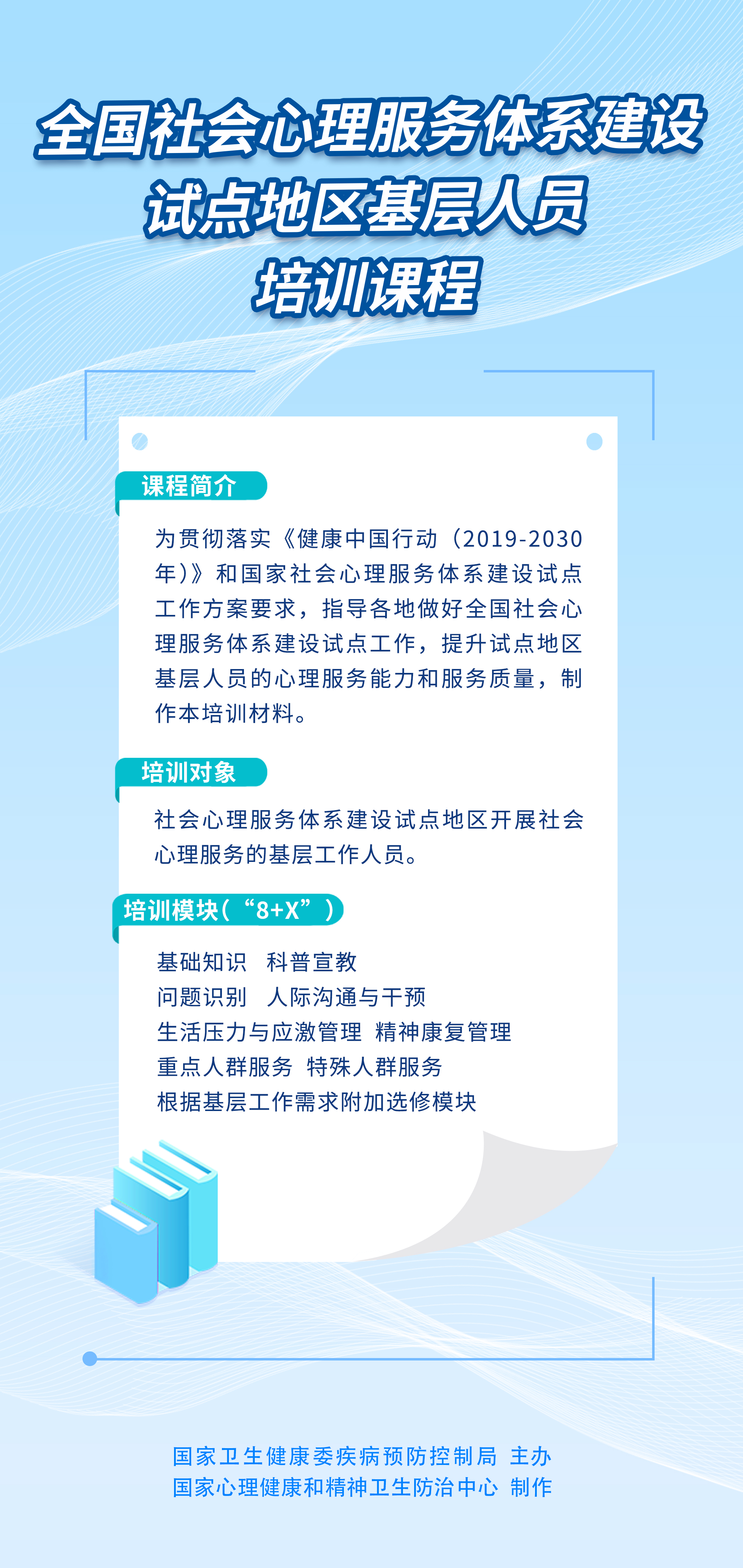 方案涉及的培训对象主要是社会心理服务体系建设试点地区负责社会心理服务工作的基层人员,包括基层医疗卫生机构工作人员;街道(乡镇)、居(村)委会及相关部门基层工作人员;学校、企事业单位、社会组织等基层工作人员。方案明确了具体的培训大纲和主要内容。采用“8+X"模块化设计,要求