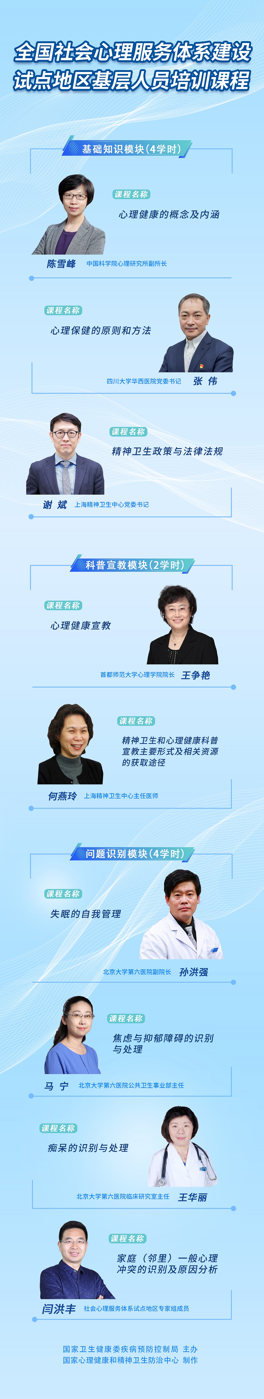 根据上述培训方案的要求,国家心理健康和精神卫生防治中心组织专家录制了一批培训课件,主要包括基础知识、科普宣教、问题识别、人际沟通与干预、生活压力与应激管理、精神康复管理、重点人群服务、特殊人群服务等8个基本模块,同时根据培训对象的不同需求,增加风险评估与转诊等特定的附加模块。